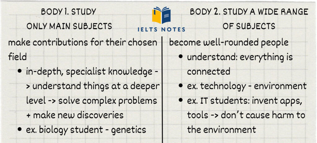 On the other hand, I would argue that it is better for students to be exposed to a variety of subjects (overall opinion). This is because the ultimate purpose of education is to equip students with the knowledge and skills needed to help them become well-rounded people (main idea). Studying a diverse range of subjects helps students understand that everything is connected; therefore, they should always take into account other aspects before making a decision (supporting idea). Environmental studies, for example, teaches a computer science student that being an IT specialist is not just about inventing new apps and tools, but also about making sure that such inventions do not cause harm to the natural world (example). If IT students just focus on their main subjects, they might ignore other concepts, like the relationship of technology and the environment, which are outside their majors (alternative).