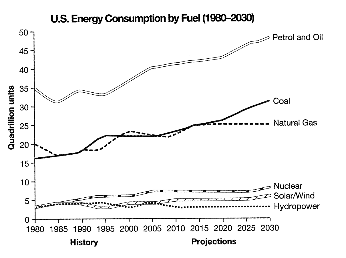The graph below gives information from a 2008 report about consumption of energy in the USA since 1980 with projections until 2030.