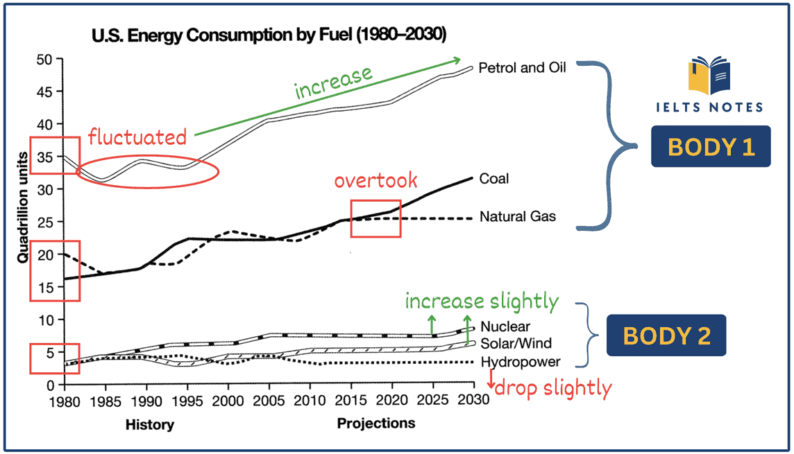 The line graph compares the consumption of six types of fuel in the US from 1980 to 2030. Overall, total energy use is expected to rise, with petrol and oil continuing to dominate U.S. energy consumption and renewable and nuclear power remaining the least significant sources of energy.
